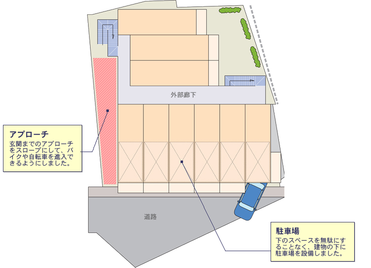 また、建物下には駐車場をご提案し、玄関までのアプローチをスロープにして、バイクや自転車が進入できるように整備しました。